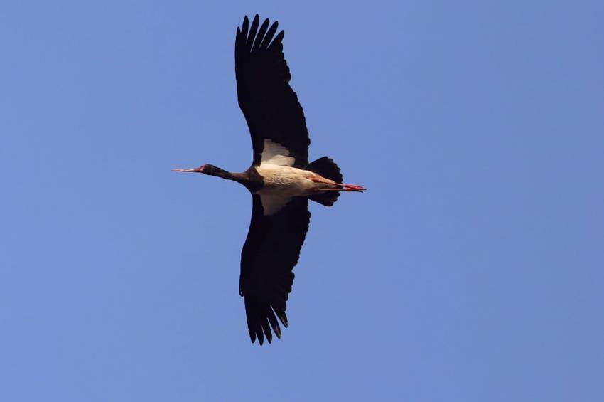 生态习性上,黑鹳主要栖息于大型湖泊、沼泽和河流附近,繁殖于崖壁或高树上,越冬时多活动于开阔平原,冬季可能以家族群形式活动。它们不善鸣叫,性机警且怕人,主要在沼泽和湿地上觅食鱼、蛙、甲壳类和昆虫等食物。其繁殖期为4至7月份,3月初至4月中旬开始营巢,偏好人为干扰较小的偏僻处筑巢,窝卵数通常为4至5枚,第一枚卵产出后雌雄亲鸟便轮流孵卵。黑鹳一般3至4年性成熟,寿命可达二三十年。值得关注的是,这已是保康县短期内第二次记录到国家一级保护鸟类新记录。去年11月,观测人员曾在马桥汾清河监测到中华秋沙鸭,此次黑鹳的发现再次刷新了当地鸟类资源名录。