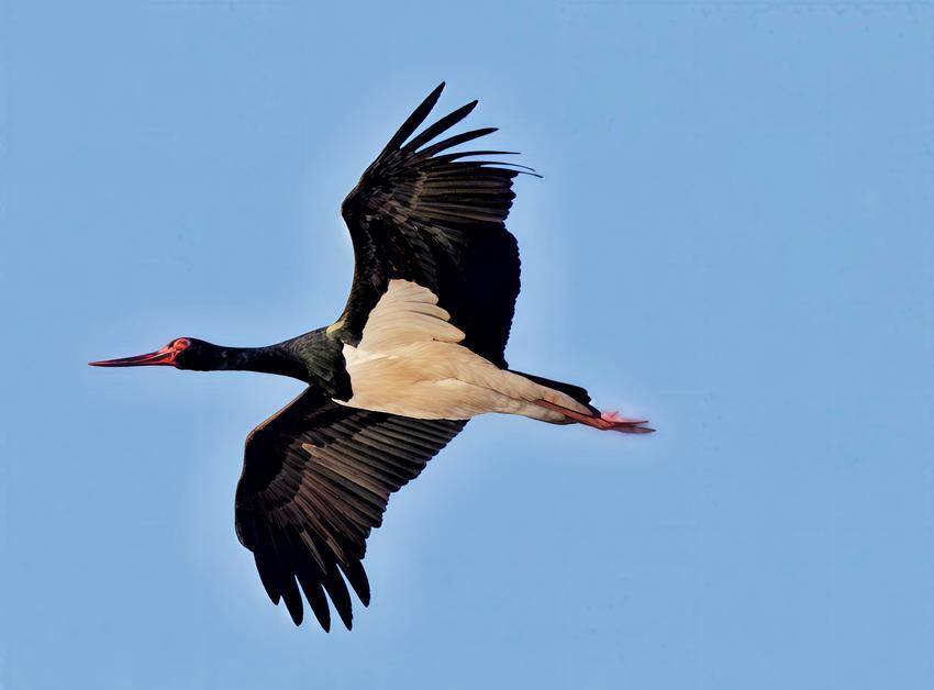 黑鹳隶属鹳形目鹳科鹳属,是全球珍稀濒危的国家一级保护动物,因其数量稀少、对栖息环境要求极高,被誉为“水中大熊猫”。资料显示,黑鹳头部、颈部和脊部呈黑褐色,上体羽黑色并带有绿紫色金属光泽,胸腹部羽为白色,嘴和腿均呈红色,两性形态相似。成鸟嘴长而直,基部较粗、往先端逐渐变细,脚长且前趾基部间具蹼,虹膜呈褐色或黑色,眼周有红色裸露皮肤;幼鸟头部、颈部和上胸为褐色,且具棕褐色斑点,嘴和脚呈褐灰色或橙红色。