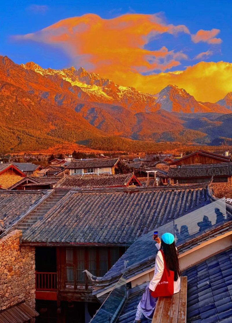 古镇地处玉龙雪山南麓,距离雪山仅10余公里,无过多高楼遮挡,无论是古镇内的观景台,还是沿街二层以上民宿的露台,均可清晰眺望雪山主峰,尤其适合不想早起赶远路的朋友。