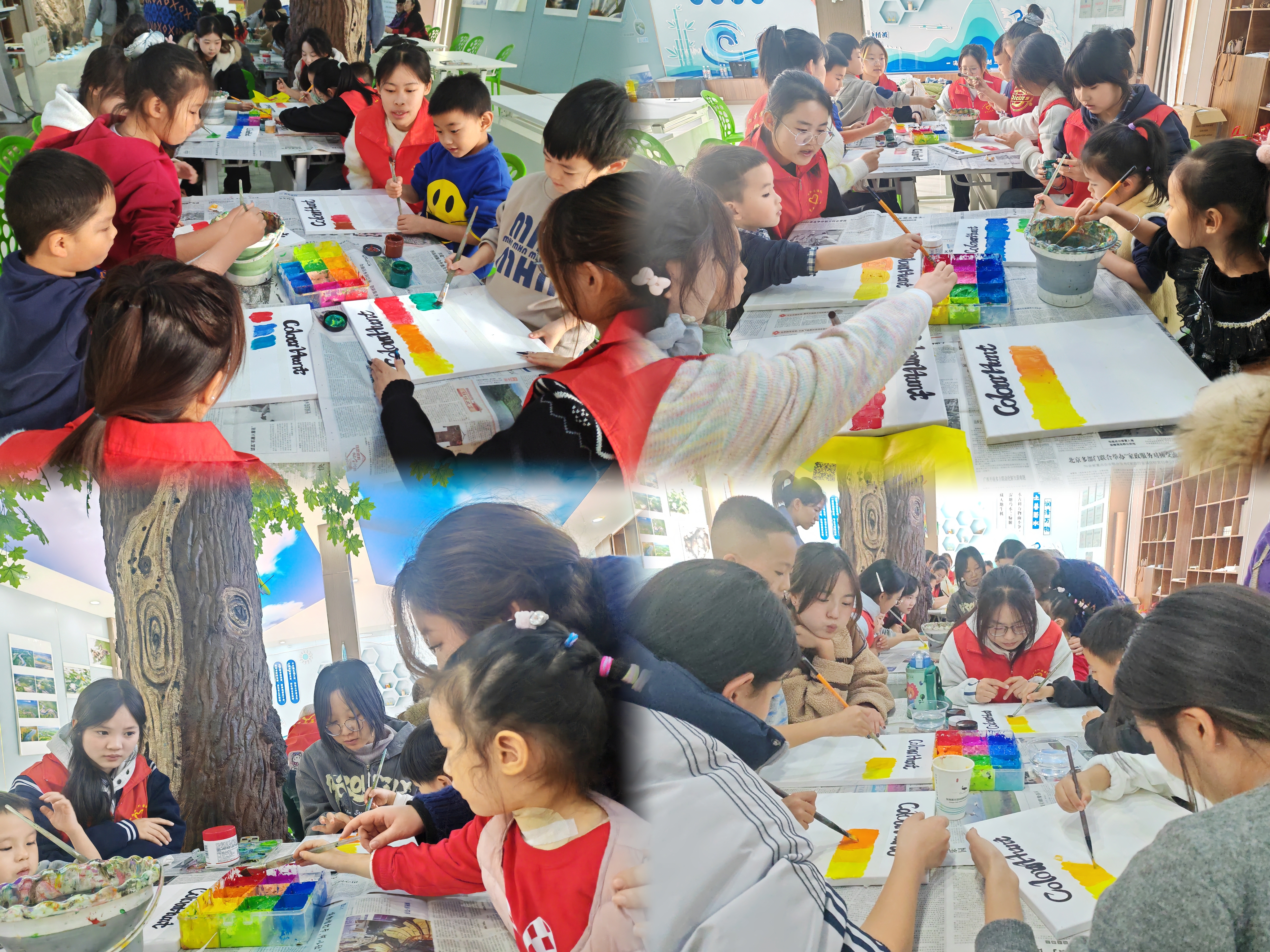 “小朋友们看,这是像油松的深绿色,这是像芦苇的金黄色,风一吹,湿地的叶子就会换上这些漂亮的颜色哦!” 课堂上,导师拿起颜料卡,用湿地常见植物解读色彩,很快勾起了大家的兴趣。随后,孩子们迫不及待地拿起画笔,在画纸上涂涂画画:有的小朋友认真涂出一片“甜甜的紫红色”,说要找紫叶稠李的叶子;有的则混搭出“黄绿渐变”,说见过柳叶一半绿一半黄的样子。不一会儿,一张张色彩鲜亮的“彩叶卡片”铺满桌面,导师细心地帮孩子们把画纸摆到座位旁晾干,等待接下来的“湿地寻叶大冒险”。