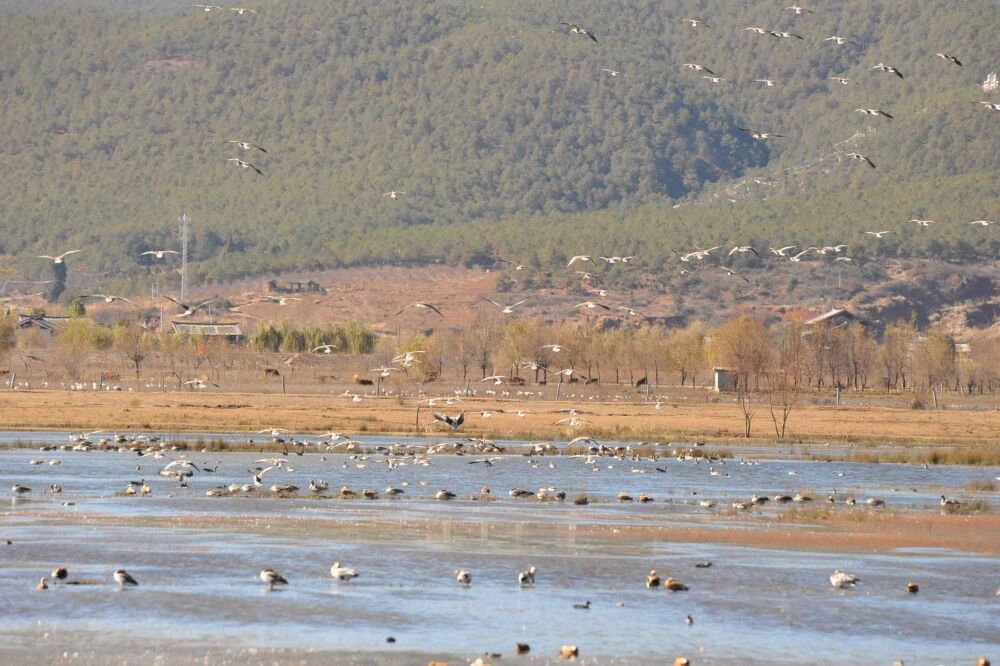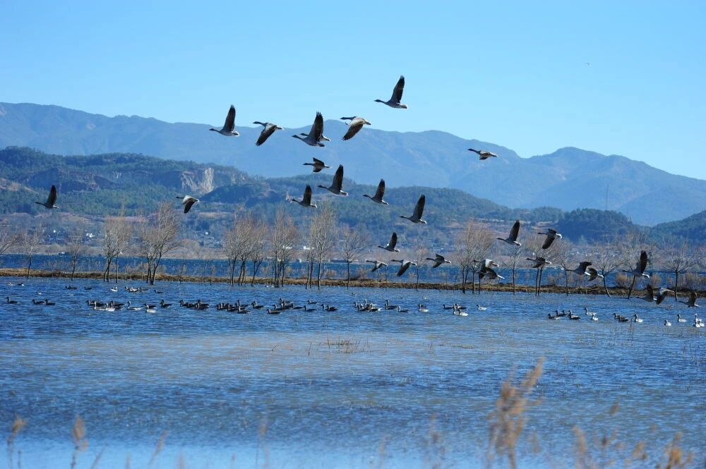 每年冬春季,有超过10万只水鸟在拉市海越冬,场景十分壮观。许多观鸟爱好者和游客纷纷来到拉市海湿地观鸟,并用镜头记录下候鸟蹁跹的美景。